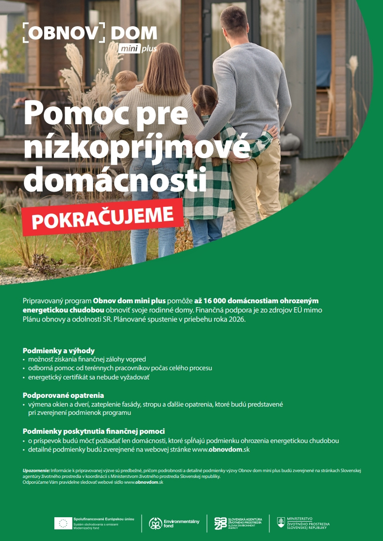 V mene Slovenskej agentúry životného prostredia si Vás dovoľujeme pozvať na stretnutie k pripravovanej výzve Obnov dom mini plus, ktorá bude pokračovaním úspešného programu Obnov dom mini. Súčasťou stretnutia bude aj možnosť osobnej konzultácie.